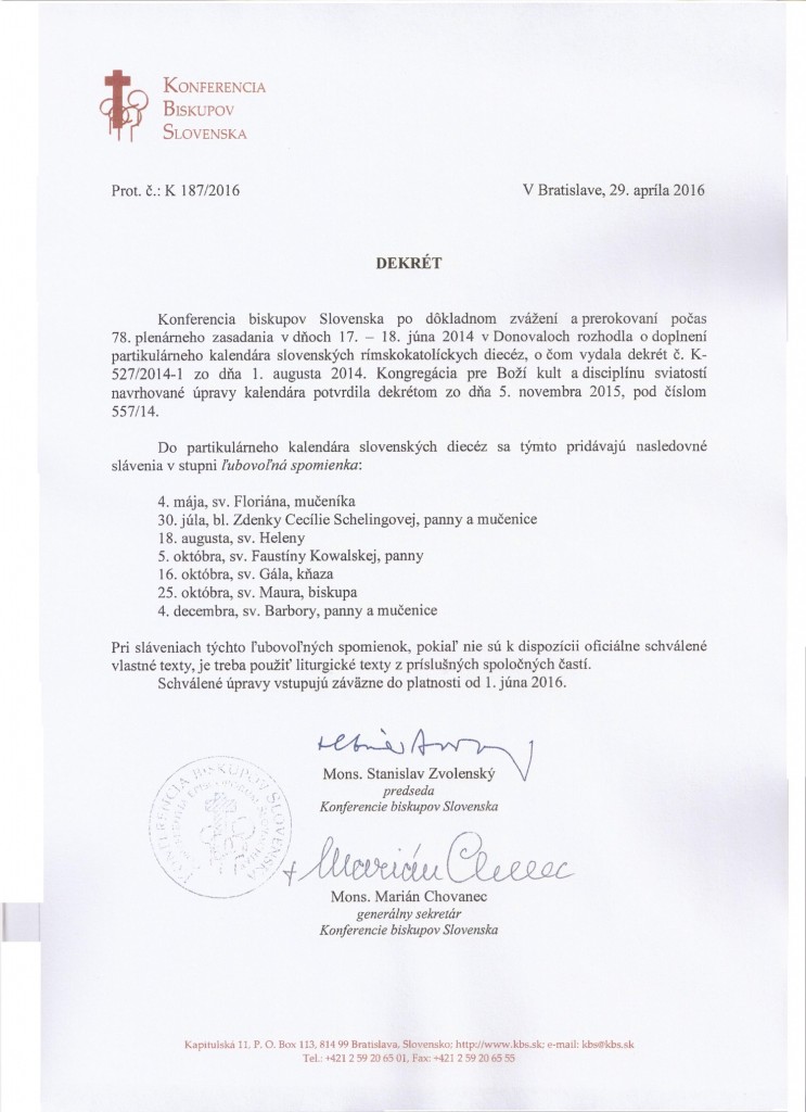 | 5.júla | SLOVANSKÝCH APOŠTOLOV | 10:00 | Sv. omša za duchovné povolania |