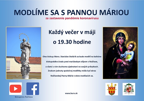Ešte stále sa nemôžeme modliť spolu, ale jedna možnosť, možnosť duchovnej jednoty je tu stále. Každý večer v máji sa budem modliť na balkóne biskupského úradu, ktorý je pred mariánskym stĺpom Nepoškvrnenej v Rožňave. Pripomína mor z roku 1710. Bol postavený na znak vypočutých prosieb za záchranu pred morom a stále stojí na Námestí baníkov v Rožňave, žiaľ, možno už málo všímaný. Pri ňom budeme prosiť Nepoškvrnenú Pannu Máriu o záchranu. Večerný čas a spôsob modlitby zverejníme na našej stránke. V stanovenú hodinu sa budeme môcť duchovne zjednotení modliť spoločne v celej diecéze na tento úmysel a pridať sa môžu aj veriaci z iných častí krajiny. Matka Božia nám pre Kristovo zmŕtvychvstanie znova vyprosí záchranu. Pomôže nám odvaliť kameň z hrobu našej neistoty.